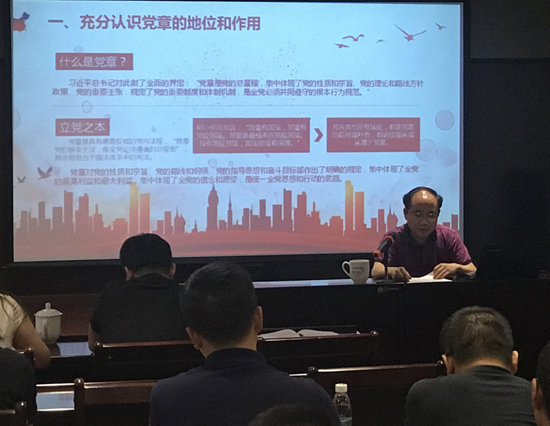 黨總支書記、總裁劉健同志在《學(xué)習(xí)尊崇黨章,爭做合格黨員》的黨課中,從黨章的地位、作用、歷程等方面向黨員全面解讀了中國共產(chǎn)黨章程,從黨章規(guī)定的黨員義務(wù)、習(xí)總書記系列重要論述及“四講四有”等角度闡述了合格黨員的標(biāo)準(zhǔn)。他希望公司黨員自覺以黨章、習(xí)總書記講話精神和“四講四有”為標(biāo)尺,隨時糾正個人的思想和行為,保持思想品德的純潔,保持工作作風(fēng)的優(yōu)良,保持工作績效的先進(jìn),保持個人行為的廉潔,主動融入公司的發(fā)展大計(jì),盡職盡責(zé)做好本職工作。