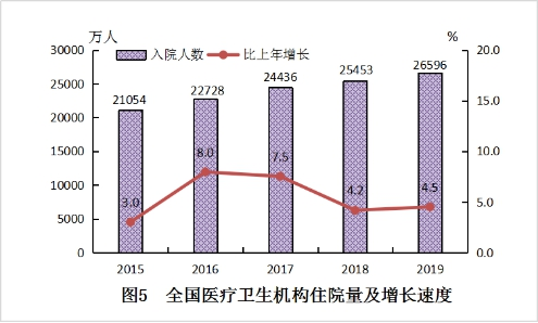 2019年,全國(guó)醫(yī)療衛(wèi)生機(jī)構(gòu)入院人數(shù)26596萬(wàn)人,比上年增加1143萬(wàn)人(增長(zhǎng)4.5%),年住院率為19.0%。